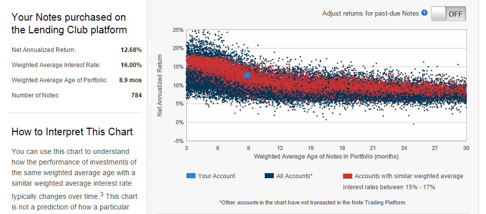 You can click on the photos to see them better, but the chart above shows that without adjusting the value of the account for notes that are currently late, but which have not defaulted, I have an annualized return of 12.68%, and that the weighted average interest rate on the notes in my portfolio is 16% The bright blue dot is me; the red dots are people with portfolios like mine and the blue dots are other Lending Club investors. You can see I'm in the middle of the pack; not the best, not the worst. You can also see that it is likely that as my portfolio ages, my returns will fall.